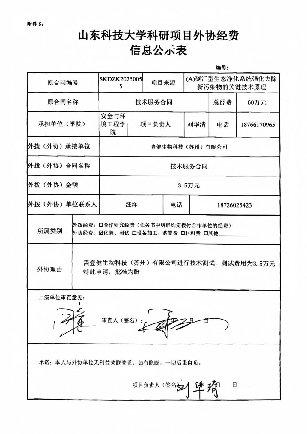 根据《山东省人民政府办公厅印发关于进一步完善财政科研项目资金管理的若干措施的通知》(鲁政办字(2019)120号)以及《山东科技大学科研项目与经费管理办法(试行)》(山科大发 〔2020)64号〕相关规定,现对刘华清为项目负责人的(A)碳汇型生态净化系统强化去除新污染物的关键技术原理项目的外协经费情况进行公示,公示时间为2025年10月15日~2025年10月22日(公示时间不少于5个工作日)。若对本项外协经费有异议,请于公示期内向色情直播-色情直播平台-色情AV 或科技处反映并提交书面材料。