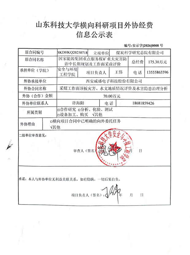 根据《山东省人民政府办公厅印发关于进一步完善财政科研项目资金管理的若干措施的通知》(鲁政办字〔2019〕120号)以及《色情直播 横向科研项目与经费管理办法(试行)》(山科大发〔2020〕64号)相关规定,现对 王伟 为项目负责人的 国家能源集团重点服务煤矿重大灾害防治中长期规划及工作面采前评价 项目的外协经费情况进行公示,公示时间为 2026年4月14日-2025年4月21日 。若对本项外协经费有异议,请于公示期内向色情直播-色情直播平台-色情AV 反映并提交书面材料。